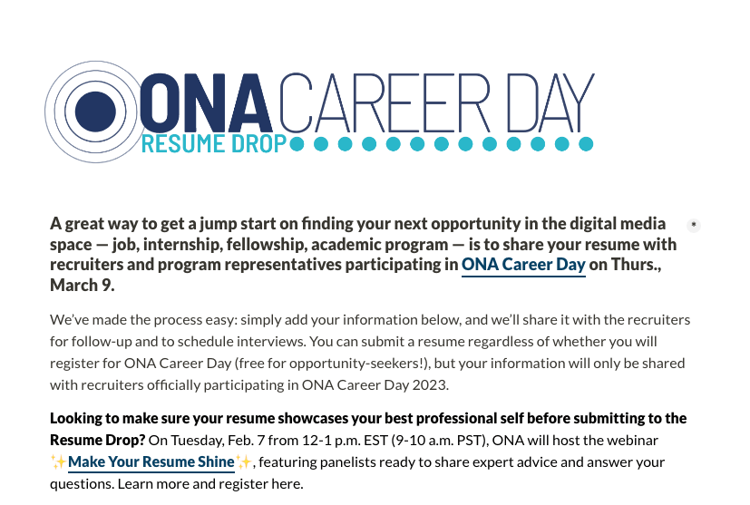 Online News Association Career Day/ Resume Review February 15, 2023Adam Chiara Visit here for details Share this: Share on X (Opens in new window) X Share on Facebook (Opens in new window) Facebook Like Loading...